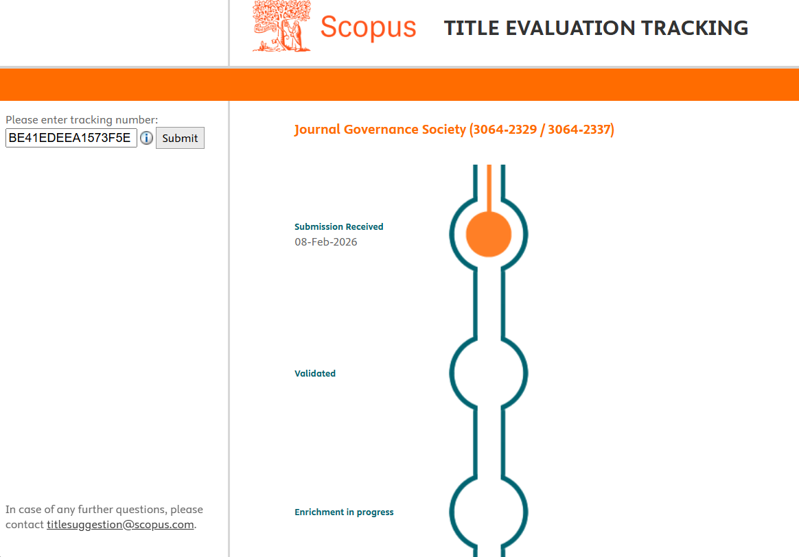We are pleased to inform you that the Journal Governance Society (JGS) has been submitted for Scopus Evaluation. This step reflects our ongoing commitment to strengthening the journal’s international visibility, publication quality, and scholarly impact in the fields of governance, and related studies.